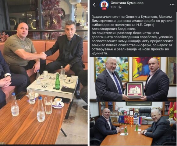 Takimi i kryetarit të Kumanovës, Maksim Dimitrievski, me ambasadorin rus Sergey Bazdnikin, ka hapur një valë të re reagimesh në opinion. Ndërsa qytetarëve u premtohej “orientim euro-atlantik” dhe shkëputje nga ndikimet e dyshimta politike, pamjet e publikuara së fundi tregojnë një realitet krejt tjetër: afrimi i radhës me një shtet që është në konflikt të hapur me linjat strategjike të Perëndimit.